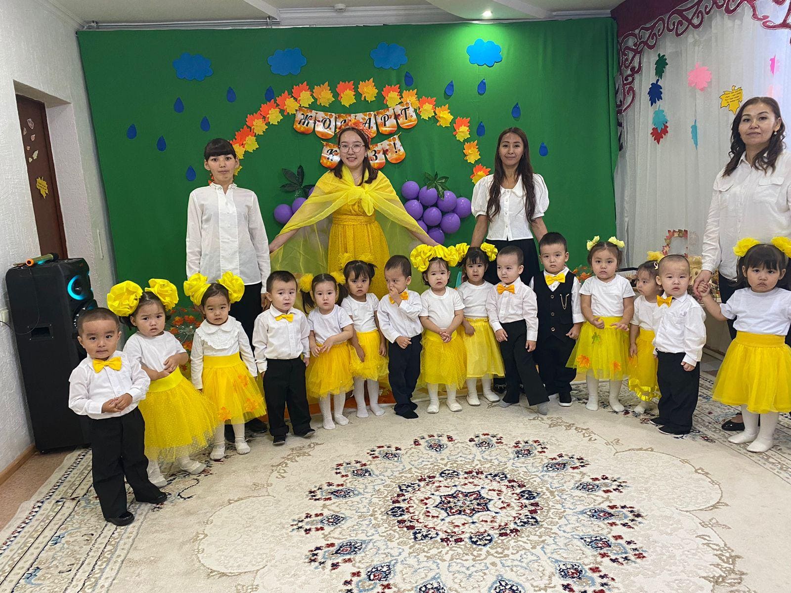 Мақсаты: Күз мезгілінің ерекшеліктерін ұғындыру. Күз өнімдерімен таныстыру, олардың ағзаға пайдасын түсіндіру. Мерекелік көңіл – күй орнату. Балаларды ән салуға, би билеуге, түрлі іс-әрекеттерге тарту, бейімділіктерін арттыру.